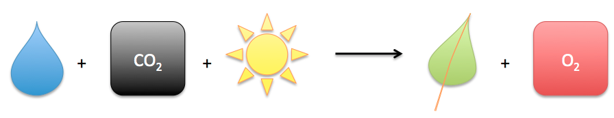 Sunlight (energy) + Carbon dioxide CO2 + Water→ Suger + Oxygen O2