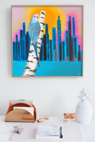 An original abstract oil painting of a budgie bird sitting on a tree looking at the Sun across the water over a silhouette of the city skyline.
